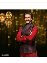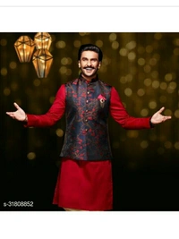 Blue printed nehru jacket in a patterned weave, has a mandarin collar, a full button placket, sleeveless, three pockets